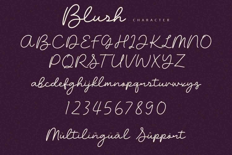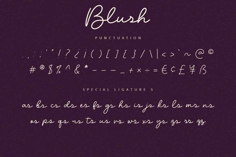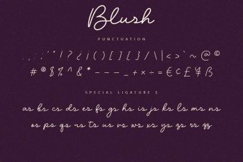 Blush is a script font with unique and modern feels. It will be perfectly used for Branding, Logo Design, Lettering, Logotype, Clothing, Poster, magazine, packaging, posters, shopping bags, t-shirts, book covers, photography, special events and other design project.