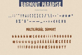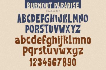 Burnout Paradise is bold display font with cute and playful feels. It will be perfectly used for Branding, Logo Design, Lettering, Logotype, Clothing, Poster, magazine, packaging, posters, shopping bags, t-shirts, book covers, photography, special events and other design project.