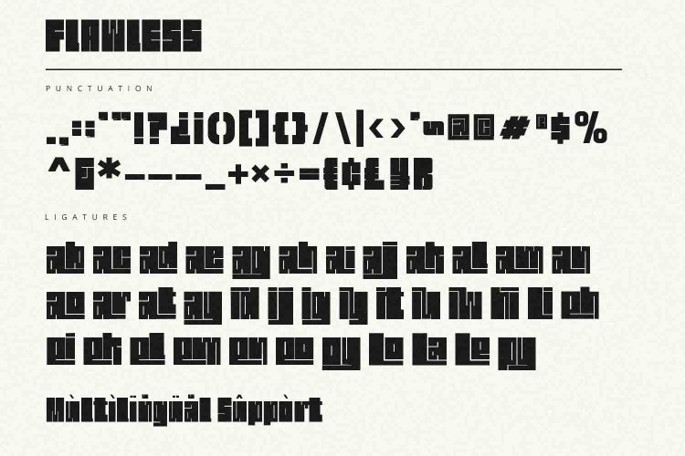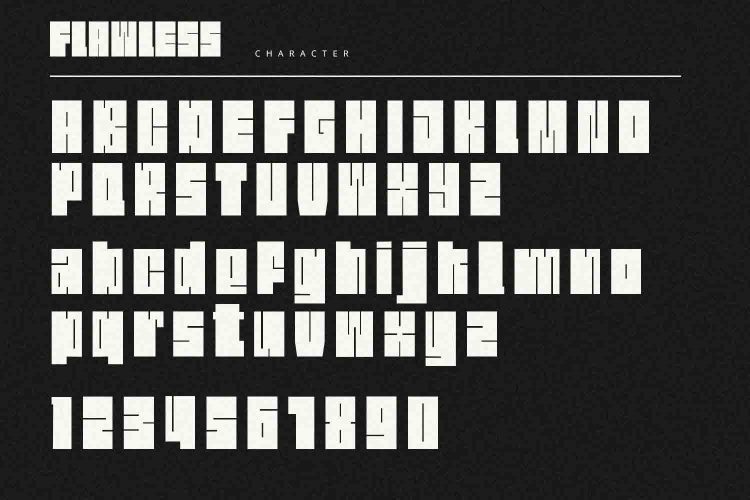 Flawless is bold display font with modern and futuristic feels. It will be perfectly used for Branding, Logo Design, Lettering, Logotype, Clothing, Poster, magazine, packaging, posters, shopping bags, t-shirts, book covers, photography, special events and other design project.