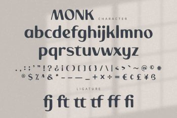 Monk is display font with bold and classic feels. It will be perfectly used for Branding, Logo Design, Lettering, Logotype, Clothing, Poster, magazine, packaging, posters, shopping bags, t-shirts, book covers, photography, special events and other design project.