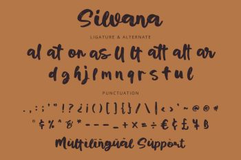 Silvana is a brush script font with unique and natural feels. It will be perfectly used for Branding, Logo Design, Lettering, Logotype, Clothing, Poster, magazine, packaging, posters, shopping bags, t-shirts, book covers, photography, special events and other design project.