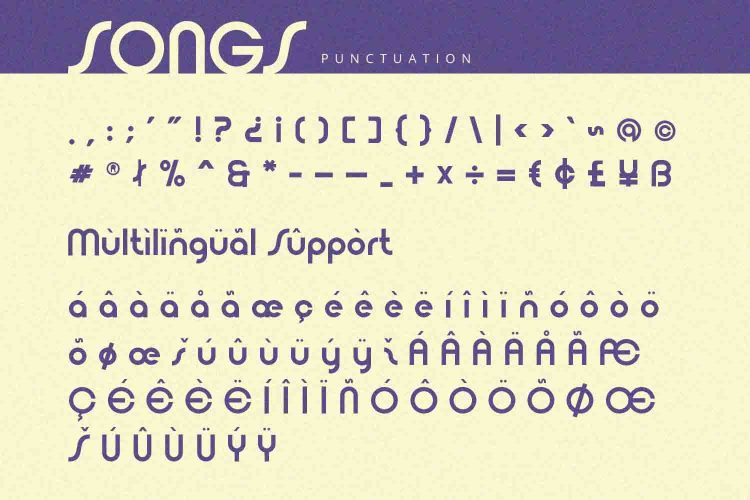 Songs is sans serif font with elegant and modern feels. It will be perfectly used for Branding, Logo Design, Lettering, Logotype, Clothing, Poster, magazine, packaging, posters, shopping bags, t-shirts, book covers, photography, special events and other design project.